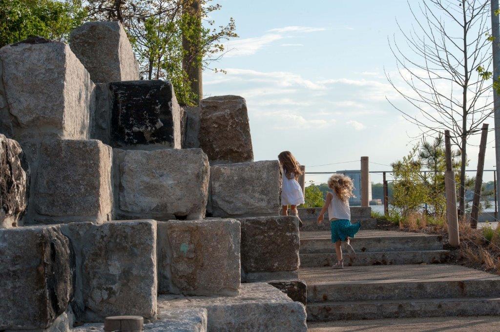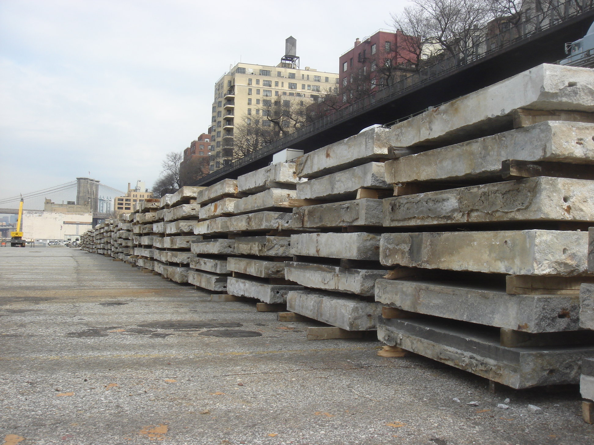 Salvaged granite can be found in other sections of the park as well. The seating at the Pier 1 salt marsh and portions of the Empire Fulton Ferry landscape around Jane’s Carousel are constructed of 3,200 cubic yards of granite salvaged from the demolished Willis Avenue Bridge.