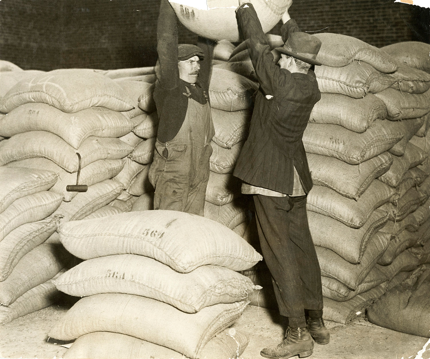 John Arbuckle (1839-1912), known as “the Coffee King,” pioneered# how coffee was made and sold by roasting and grinding coffee beans onsite, packaging the coffee in one-pound bags, and selling it across the country. Arbuckle’s Brooklyn complex opened in 1871. The waterfront site allowed vessels carrying coffee beans from Brazil to dock alongside the plant. Workers roasted, prepared, and packaged the coffee for shipment by rail to four hundred Arbuckle distributing depots across the country.